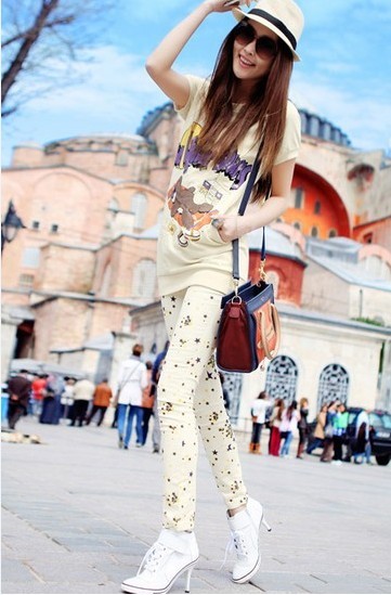 Always girls wearing printed pants on the streets can attract people's attention again and again. Pants on the feet with the flowers are brilliant and stylish enough to absorb a large portion of the eye index improved, stylish but not overly assertive. Just the right glamorous, the fragrance everywhere ,combined with slim version of model plus slender legs make people pleasing and favorability doubling.